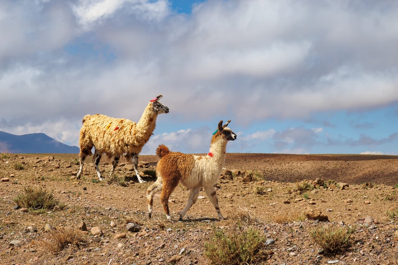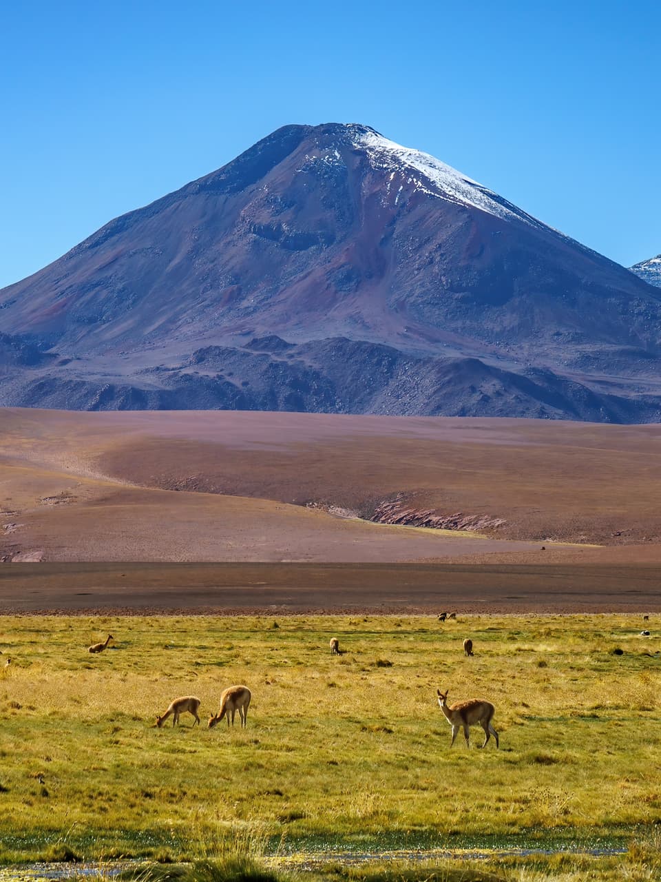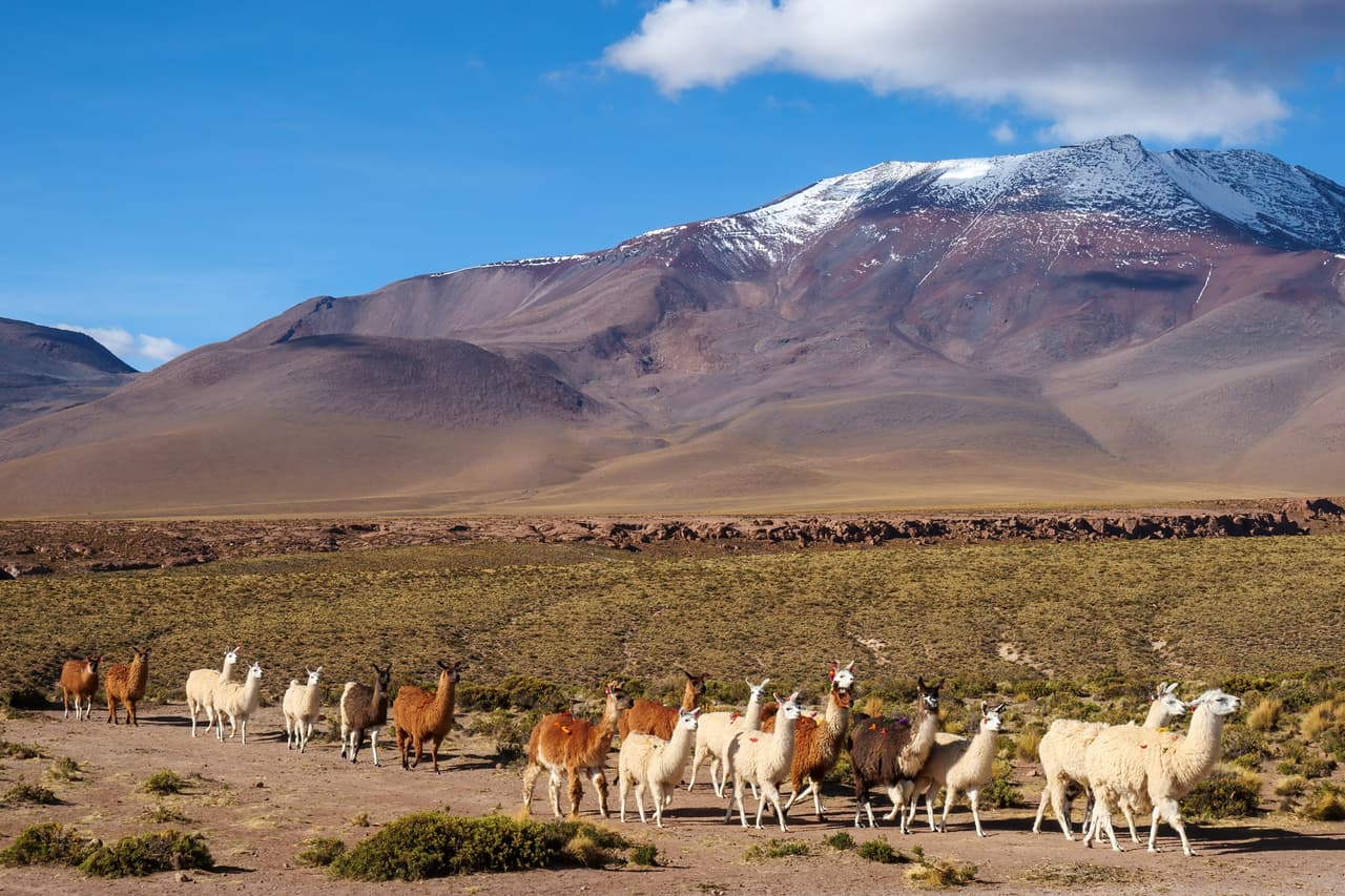 回程巧遇牧民的羊駝群(大羊駝llama,發音是yama),背景為Volcán Juriques(5704m)