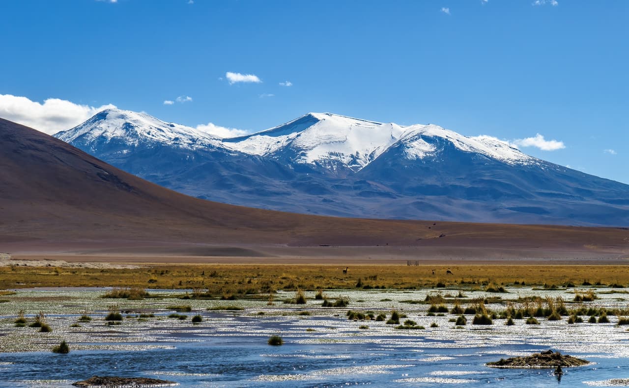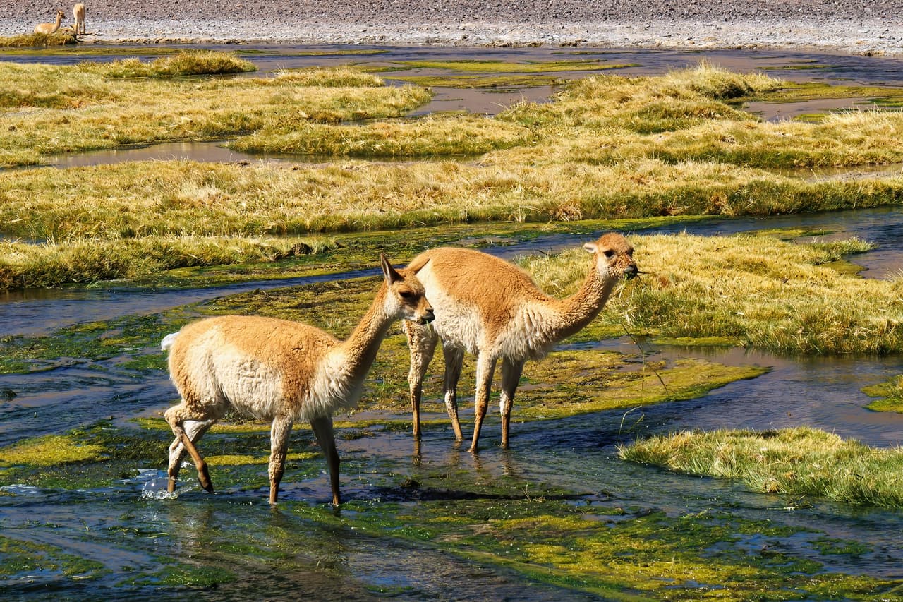 Quebrada Quepiaco,雪水為乾旱高原帶來了少數綠洲,可看到野生羊駝(小羊駝vicuña)和火烈鳥(西:flamencos,英:flamingo)