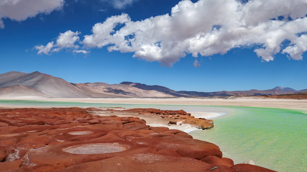 告別Lagunas Miscanti y Miñiques,前往另一個景點Piedras Rojas,不同於Lagunas Miscanti y Miñiques的湛藍,Piedras Rojas則是一片積水的鹽灘,青綠色的鹽水與深紅色的岩石,以及藍天白雲和雪山,構成了豐富的色彩