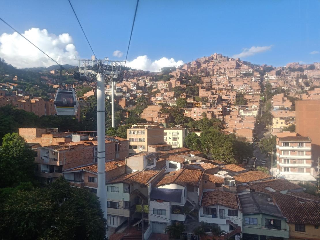 搭纜車捷運前有點小緊張,因為纜車捷運跟摩天輪一樣,不會為了你停下來,車到了,人沒踏進纜車就只能等下一台。順利進入之後,我被眼前的景象震懾住了,遠方的高山包圍著整個麥德林城市,建築物在這裡一覽無遺,越接近山上,高樓就越少,出現在眼前的是無數的磚瓦房和樹木交錯相疊的景象,緊密的程度讓人止住了呼吸。當時正逢聖誕節前夕,纜車剛出發時還能清楚地看見街道上的情景,有搭好的色彩繽紛的聖誕節裝飾,為全是橘紅色的磚瓦添上幾分過節的氣息、還有正在踢足球、互相追逐嬉戲的孩子們,我還看見很多的房子的屋頂僅用幾片鐵皮蓋上,順著鐵皮屋頂的視線,也看見有些婦女正在曬衣服……,全都是一些我們所知道的日常,當時我心裡卻有一種說不出的違和感。