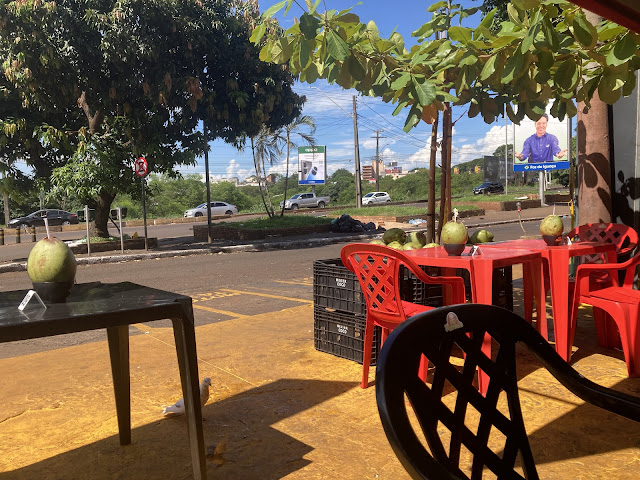 抵達市區公車轉運站, 原本我在地圖上看到附近有漂亮的早餐咖啡店想去, 沒想到那間那天沒有營業, 可能還在放假。於是在轉運站的小糕點攤吃早餐。吃巴西常見的鹹水餃coxinha(發音為【ko-sin-ya】, 鼓槌的意思)(其實乍看之下有一點像鄭成功的英文名字Koxinga), 外型很特別, 是水滴狀的, 外表有炸過, 裡面是黏黏的麵皮, 裡面有包肉餡。之前在巴拉圭的巴拉瓜里吃過覺得不好吃, 但是這次在轉運站的是熱的, 比較好吃。再點一個雞肉派, 在這裡似乎也被叫作恩潘納達。一小杯加了牛奶的咖啡, 裝在塑膠杯內。三樣東西共14R。