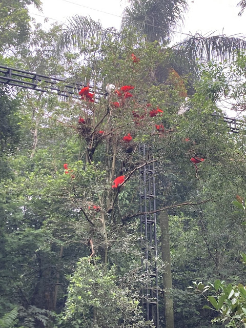 照著園區規劃好的路線走, 第一種會看到的鳥類是美洲紅䴉(唸ㄏㄨㄢˊ或ㄒㄩㄢˊ)scarlet ibis。全身包括雙腳都是不自然的鮮紅色, 非常搶眼, 體型不大。長嘴與眼睛是黑色的。