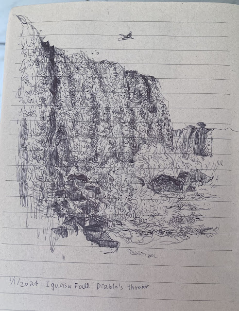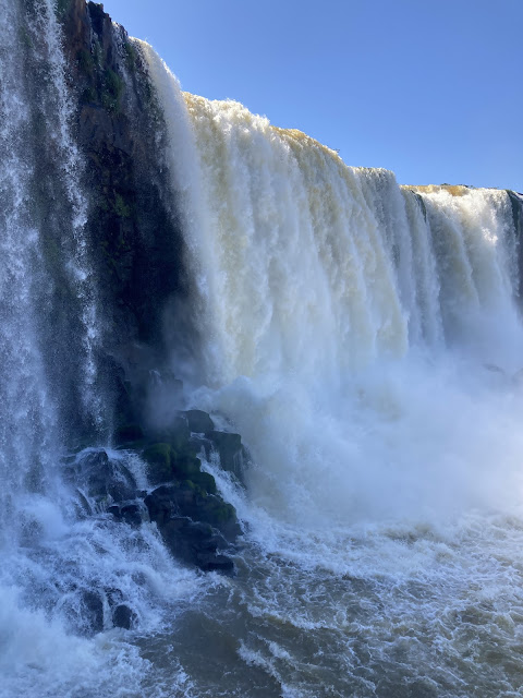 園區其實沒有很大。搭上遊園車一條路直直走,可以選擇在不同的觀景點下車。我選擇在最後面的Diablo's throat(惡魔喉嚨)下車,可以非常近距離看到瀑布,非常震撼。巨大且充滿力量的水柱滾滾下衝,可以感受到水力造成的地面振動、轟隆作響的水聲掩蓋住人聲。不間斷的水也叫人看得目不轉睛,瀑布四周水氣瀰漫,有些水霧甚至遮蓋住大半瀑布, 更覺神祕莫測。惡魔喉嚨觀景點旁就有賣恩潘納達與其他熟食的小販,很香,害我很餓,早上只有吃昨天巴拉圭蘭花旅館偷出來的麵包與蘋果。我沒有準備其他食物(昨晚旅館附近也都沒有小商店),發現這個園區內販售的食物貴得不合理又不好吃,沒有自帶食物來很失策。相比之下, 隔天去的鳥園內的餐廳好吃價格又合理(鳥園的園區設計與設施比伊瓜蘇瀑布好很多)。