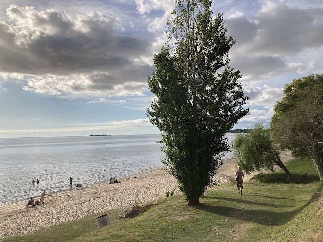 接著再次跨上鐵馬, 沿著河濱大道往北騎行。一路上有許多美麗的沙灘, 河濱也漸有綠地公園與長椅。我們隨意選了其中一個沙灘Playa Urbana El Alamo, 在這裡停好腳踏車, 在沙灘上休息戲水。許多當地居民也在這裡玩水, 有友善的沙灘大流浪狗。再來, 我們繼續往北騎, 到Playa Urbana Real de San Carlos, 也在這裡的沙灘上坐了一下。