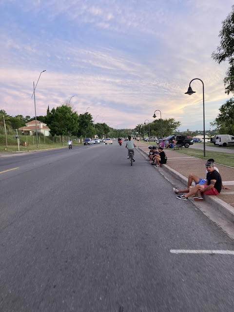 撇開臭蚊子不說, 相隔一條拉布拉他河, 這裡是美麗休閒小鎮, 對岸則是擁擠忙碌(還有惡性物價通膨)的大城市, 非常不同。夕陽的顏色非常鮮豔且多變。回程中在超市買了晚餐: 沙拉159 uyu(看一下我們中午吃的東西就知道為什麼了)、西瓜, 小的半顆 30 uyu、兩顆水蜜桃 95/kg、一個神祕的炸甜點叫做 pastel frio (pastel=pastry, frio=fried, 翻譯過來就叫做炸糕點) 60 uyu。這裡的可頌不再叫做半月了, 就叫做croissant 或 pan con grasa (有油的麵包)。