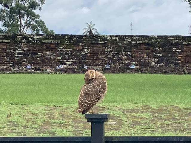 我抵達時, 雨停了, 不久之後太陽也出來了。各種不同的野生鳥類來了。在遺址園區中我看到好幾隻貓頭鷹, 在白天看到覺得很稀奇, 而且牠們離我距離很近, 也不怕人類。我經過幾隻站在電箱上的貓頭鷹, 距離很近, 牠們沒有飛走, 但是把頭歪成九十度斜眼打量我, 非常可愛。牠們是穴鴞burrowing owl, 在白天活動, 住在地下洞穴。貓頭鷹的西班牙文是buho。
