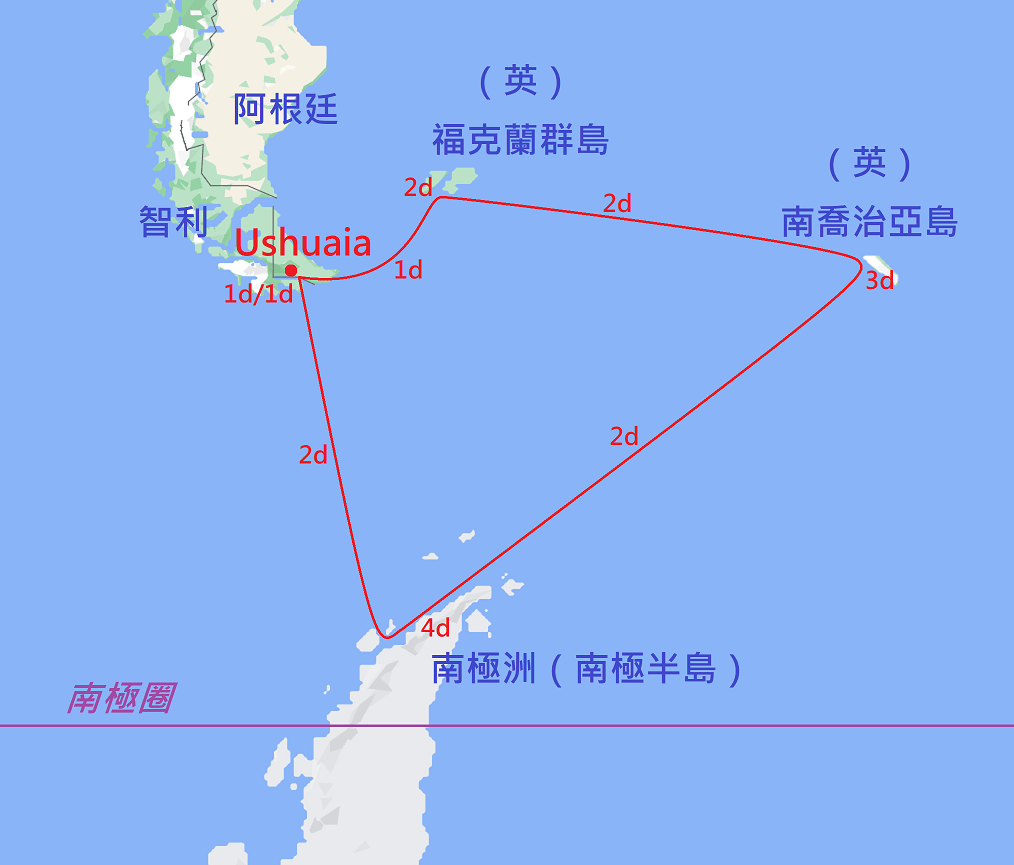 這就是本鵝參加的行程,路線比Classic Antarctica再往南,延伸到南極圈內。雖然南極圈只是地圖上的名詞,但本行程重點是在南極的有效天數增加至7天,這點非常重要,天數的增加意味著好天氣機率、巡遊登陸次數也會增加(天氣部分後面會說明),因此本行程最推薦給以南極為目標、想拍更多照騙,並且時間較充裕的一般遊客。總天數13天,上一季最終價約6000~8000。