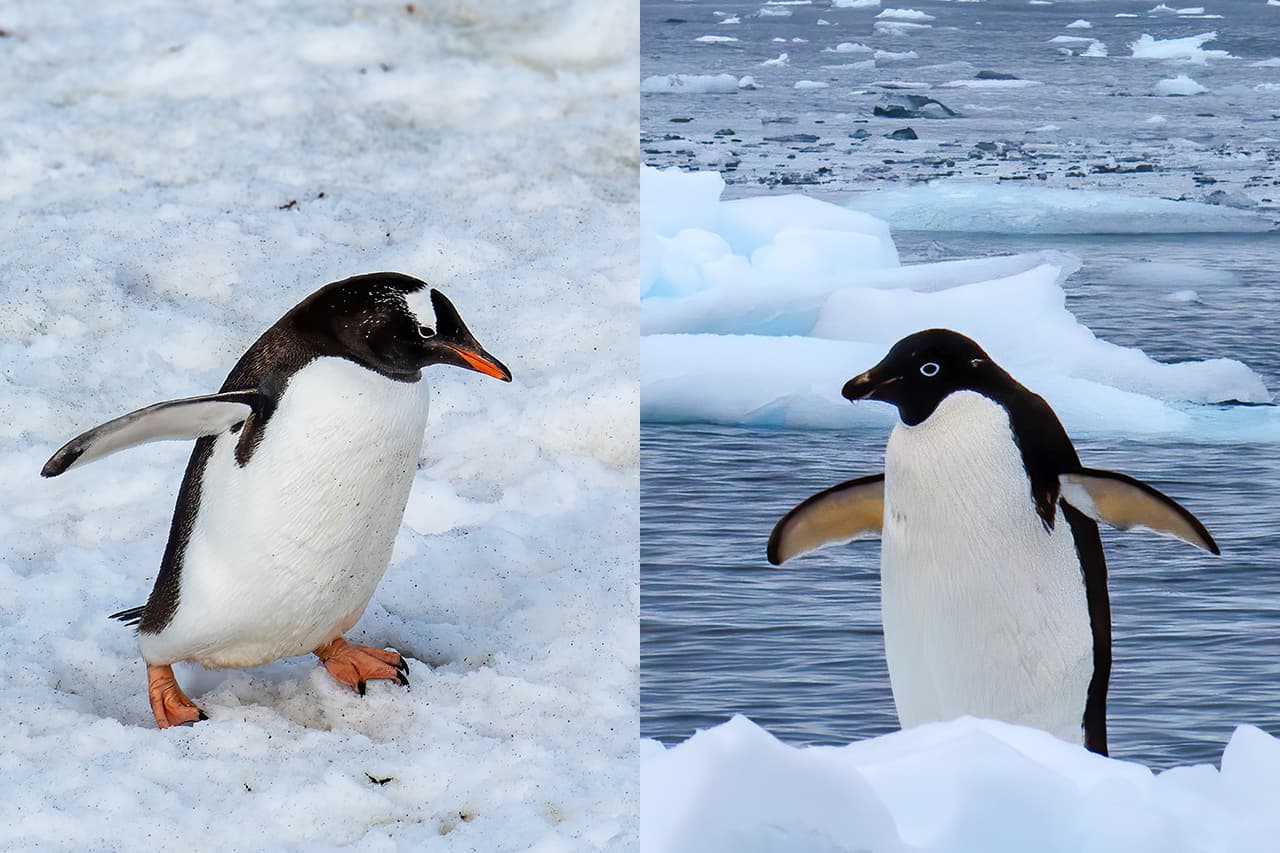 A:Gentoo是南極半島最常見的企鵝,基本上每天都會看到,牠們也是體型第三大、游泳速度最快的企鵝。第二多的就是阿德利企鵝(Adélie),牠們不但是唯二只分布在南極的企鵝(另一種是帝王企鵝),別的大陸看不到,更是少數會性交易的動物。還有Chinstrap也有機會看到,可惜我只看到了兩隻,而且沒有拍到,這三種企鵝同屬於阿德利企鵝屬。 至於帝王企鵝,因為鵝口本來就不多,又分散在整個南極,加上繁殖期也不在夏天,而且比起陸地牠們更喜歡冰棚,所以一般遊客幾乎是看不到的。 除了企鵝外,各種海鳥、海豹和鯨魚也是重點動物,尤其是鯨魚故意靠近橡皮艇,在你身邊噴水、翻起鯨尾,更是最刺激的體驗。此外南極沒有草木土壤,雪地及岩石上的綠色、粉紅色微生物,是南極唯一的植被,以動物毛髮和糞便為養分,因此雪地的顏色也可用來判斷企鵝的分布。