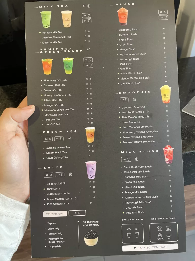 - 菜單與價位:中杯8索爾、大杯9索爾(台幣70~80元)左右,加珍珠+1索爾(約台幣9元)