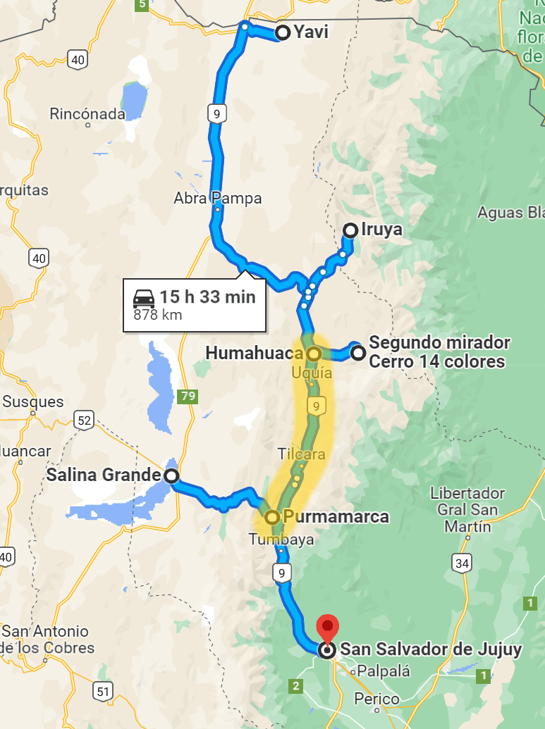 此行走過的路線,圖中黃色從Purmamarca到Humahuaca這一段便是旱谷