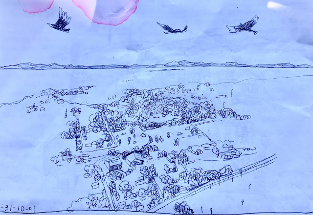 我在一有景的地方席地而坐速寫, 但是地上有一隻美麗的春象類的昆蟲咬我! 後來在巴西也遇到類似的蟲, 我穿泳衣坐在沙地上,蟲直接咬我屁股! 看到樹幹上有大蜂窩,隔天爬另一個郊山時也有大蜂窩和疑似虎頭蜂的昆蟲。