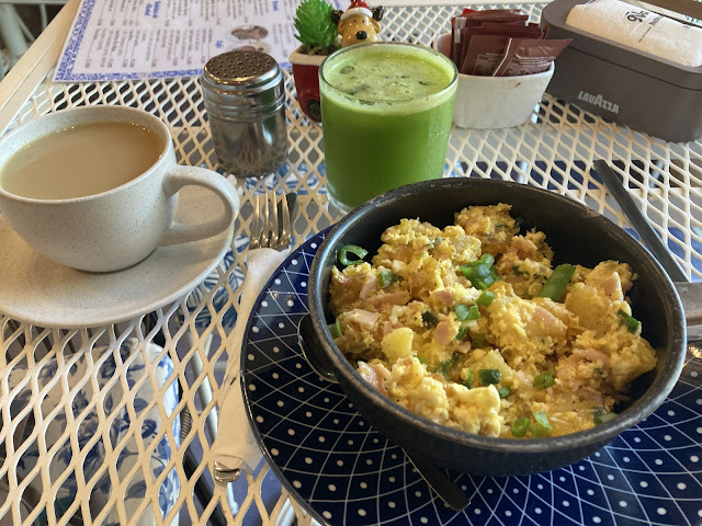 我選了菜單上的「Paraguayoite Brunch」巴拉圭式早餐,35k (4.8 usd)。內容是mandi'o (yucca, 木薯) chyryry (hashbrown, 炒碎的) con cebollite de verdeo (青蔥),也就是切小塊的木薯和蔥、蛋一起下去炒,很美味。另外還有jugo verde綠果汁(非常好喝)、cocido(裝在咖啡杯的瑪戴茶) con leche(加牛奶)。