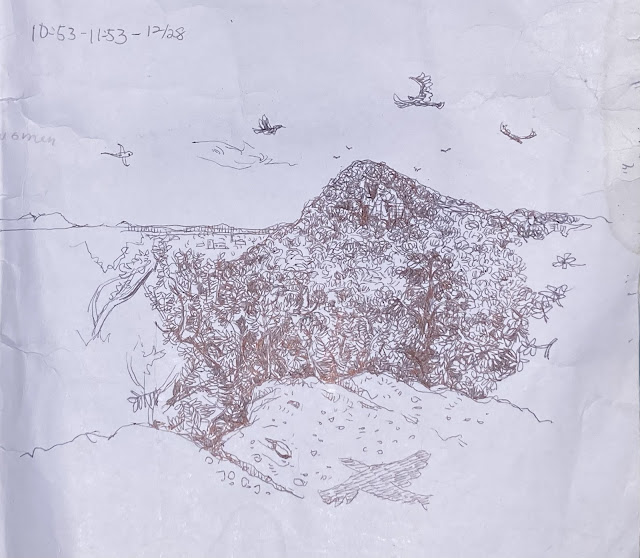我坐在洞穴凸出來的獅子王平台速寫, 但後來發現有一個疑似虎頭蜂的窩在離我很近的地方, 毛毛的。