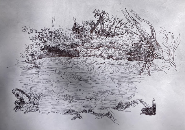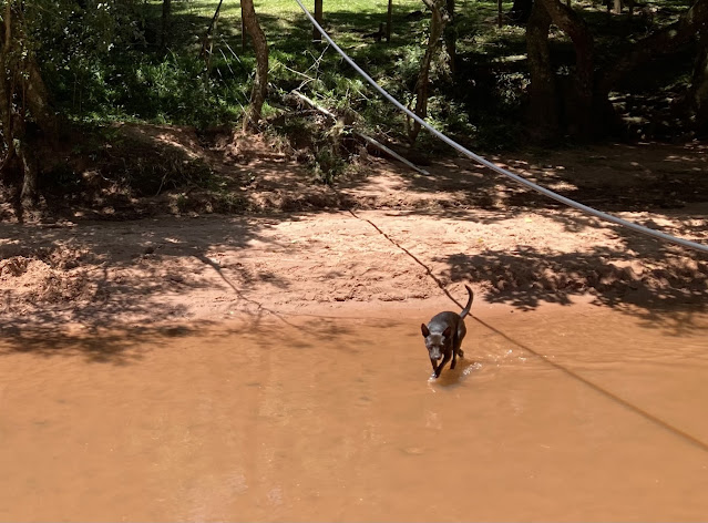 沿著小溪往右走, 下游的方向走, 有人停車在那裡休憩、喝瑪戴茶、大聲播放音樂, 所以似乎另一邊有汽車的出入口。往左走的話很快陸路就被私人土地擋住, 也許溯溪往上可以, 但我就沒有往那邊。溪水不清澈, 蠻多泥沙的, 但算了我就接受吧! 我找了一塊不錯的溪邊空地速寫、玩水, 有許多美麗的蝴蝶, 隔天我在爬Cerro Santo Tomas時看到更多蝴蝶。有一隻很調皮的黑狗跟我玩了一陣子。我在這裡待了三個小時後, 下午四點步行回到路口等公車回去。