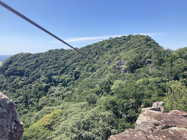 山頂有個牌子寫「zipline滑索」, 我循著牌子過去, 結果看到這山的懸崖還真有一條鋼索連接到另一個山頭! 可是鋼索看起來年久失修, 覺得很像絕命終結站裡面的滑索。在兩山頭之間, 很多禿鷹盤旋。