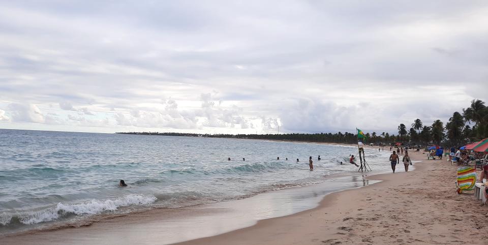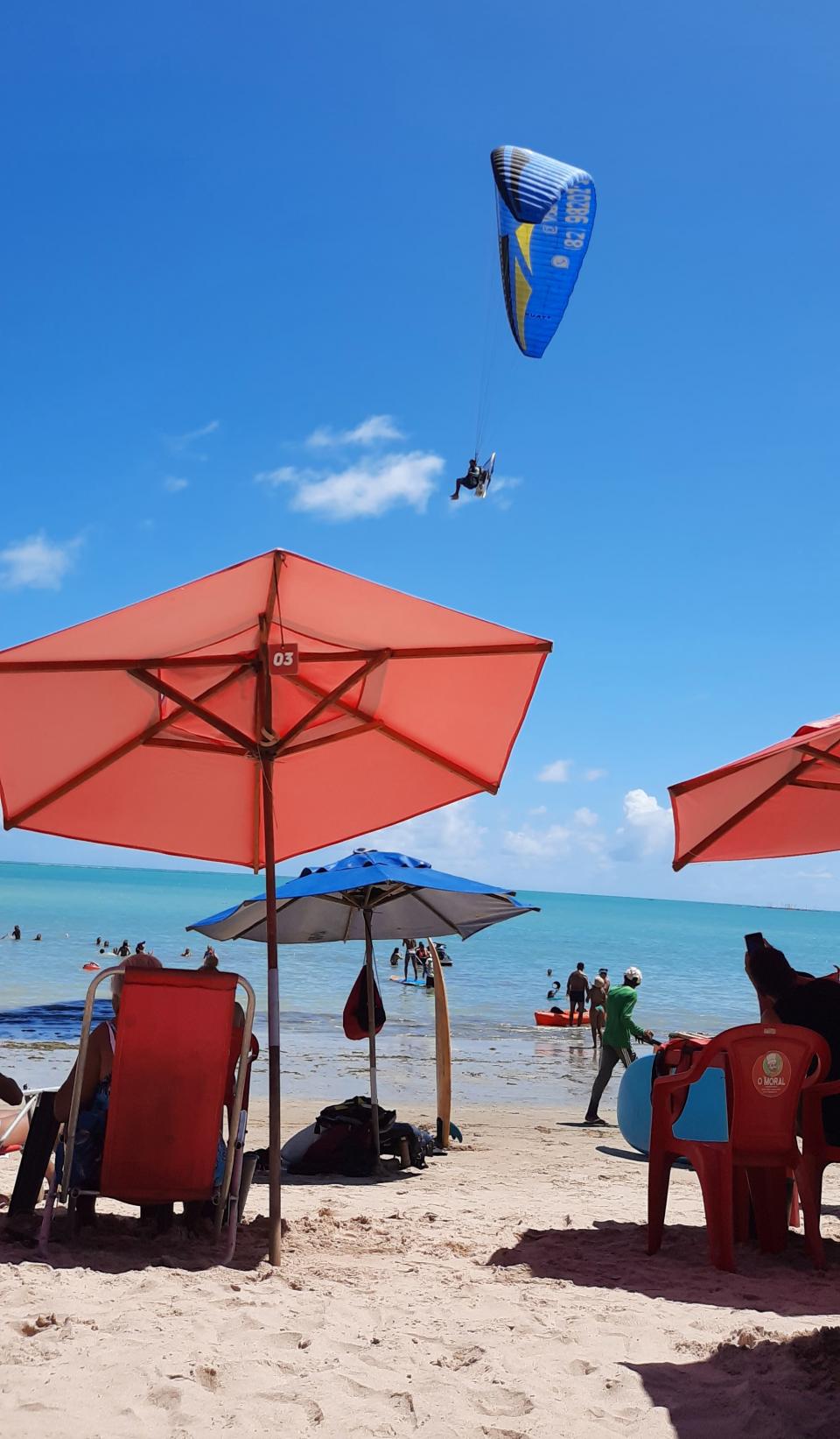 1個鐘直立板時間很快過,我租借椅子太陽傘R$10一整天,餐飲另計,沒有強迫消費,又可以放心擺低個人物品兼玩直立板,肚餓點了個Acaraje 和椰子汁,就這樣坐著發呆大半天,觀察人群,太熱就落水游泳。我知道水質不太好,玩板同時划得遠仍見到一些小垃圾,而海藻也有不少,~曬到膚色愈來愈古銅,甚至比部分有歐洲血統的巴西人更古銅色。