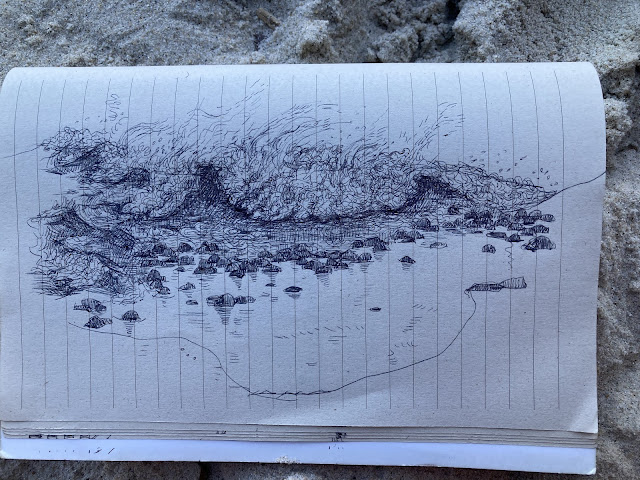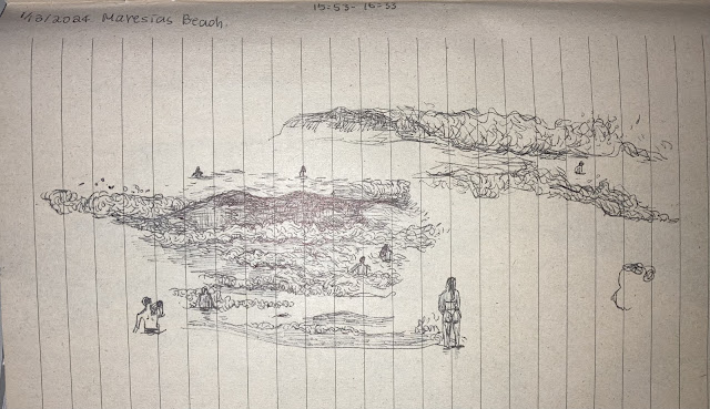 話說回來, 莫雷拉海芳角落這一帶非常美麗, 所以我在這裡待到日落。海灘的盡頭是一凸出的岩石小海岬, 可以爬上去, 一覽270度海洋美景。在爬上去的地方之前, 有許多大石散落在沙灘上, 形成小池子。這裡有一條河注入大海, 河流看起來很髒, 有布條寫著「這條河流有汙染」。我找到了有樹蔭的地方坐在沙地上寫生, 但是有蟲子咬我的屁股。海浪一波波瞬息萬變, 很難捕捉。