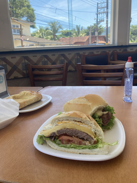 去早上同一間烘焙坊吃午餐。這次我點churrasco steak sandwich 26R, 烤牛肉薄片三明治, 非常美味! 裡面夾著融化的非常豪邁的份量的莫札瑞拉起司。也買了巴西式焦糖布丁8R, 讓人感到幸福的甜蜜滋味, 布丁底部有塔餅。再外帶一顆裡面有包火腿起司的麵包(火腿叫作peru)9R, 之後在五個小時的客運上吃。是不錯, 但還是智利與阿根廷的恩潘納達較好吃。