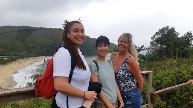 剛開始是在背包房間裡時, 另一名巴西女子試著跟我說話, 我當然完全聽不懂, 路依喜幫我翻譯。後來我們倆不約而同坐在外面桌椅空間, 我們兩人都有一本手寫遊記,我們開始聊之後就覺得超級氣味相投,越聊越久,她說那要不要今天一起出遊,我說好,但是我先去海邊看看浪況。我們互留了Whatsapp後,我跟她說我看完浪況就傳訊息給她。
