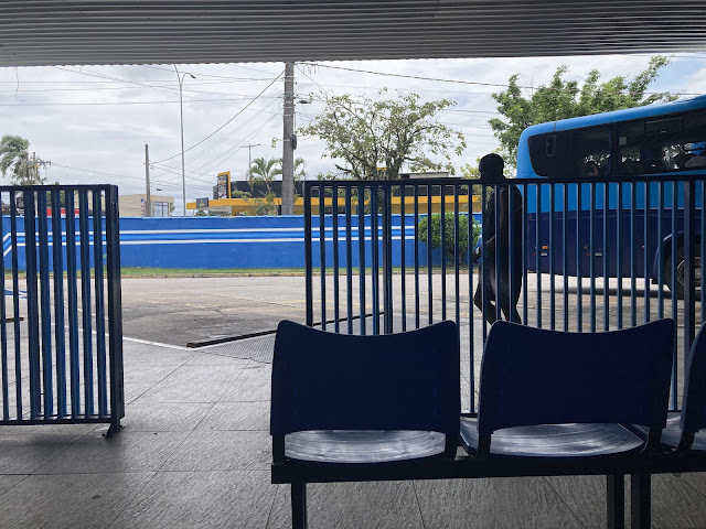 等公車時, 還有一個當地阿伯, 棕色肌膚、微壯體型(巴西標準外表), 裸著上身穿著短褲坐在這個大馬路邊看書, 也太悠閒了! 很喜歡。