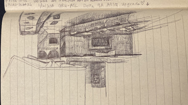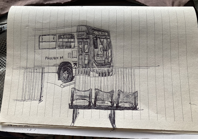 抵達Caraguatatuba轉運站, 這裡的公廁很乾淨。轉運站有三四家輕食店。我在這裡的Passaro Marron公司櫃台買了11:25前往海芳的巴士, 再買了1/15從海芳到聖保羅的巴士13:30-18:45。在椅子上寫遊記、速寫, 轉運站有免費無線無線網路。