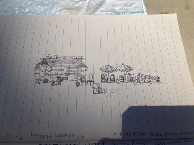 一位穿著比基尼(對了, 其實海灘上每位女性都是穿著巴西式比基尼)的巴西年輕媽媽抱著小孩來看我畫畫並用英文跟我聊起來。她說他們曾住過紐約, 但是太想念這裡美麗的海灘與天氣, 所以搬回來, 住在聖保羅。她也說了「噢對啊我之前在這裡看到梅迪納」之類的話。速寫完, 我跟著其他人爬上海岬巨石。有三位阿姨開心地在那裡自拍, 所以我請她們幫我拍照而我也幫她們拍照。大家都很親切開朗。這裡的浪其實比東邊更大, 但是浪型更好、不亂, 所以有很多高手在這裡衝。坐在岬角上也可以較清楚看到他們起乘的樣子。