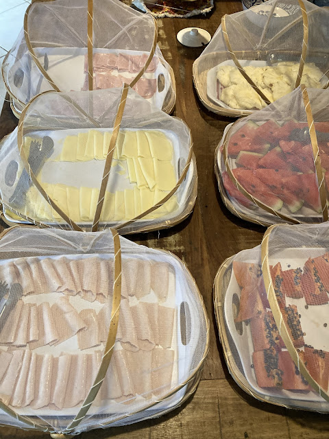 今天與明天早上, 我在旅館寬敞的半戶外長廊空間跟著Youtube Bully Juice 做運動。地板上有墊子, 所以我直接把它當成運動的墊子。今天是做十分鐘暖身、二十分鐘有氧、伏地挺身、深蹲、仰臥起坐。八點整, 去吃旅館非常豐盛的自助式早餐。也有巴西式火腿起司帕尼尼, 不過是用巴西式的法國麵包, 沒有很好。有非常好吃的木瓜、西瓜, 沒有很甜的鳳梨切片, 不過可以一起夾在帕尼尼裡。非常美味的木薯粉椰子蛋糕、檸檬蛋糕、布朗尼、中美洲式的白起司、很好吃的起司球麵包pao de queijo(後來在別的地方也吃到很好吃的, 就是只有之前在連鎖店Rei do Mate吃到的不好吃)、炒蛋、臘腸、新鮮果汁(柳橙、casa(腰果水果, 沒有什麼味道)、檸檬、百香果), 新鮮果汁也不加糖, 桌上放一罐糖, 有需要的再自己加。 我吃得非常撐。
