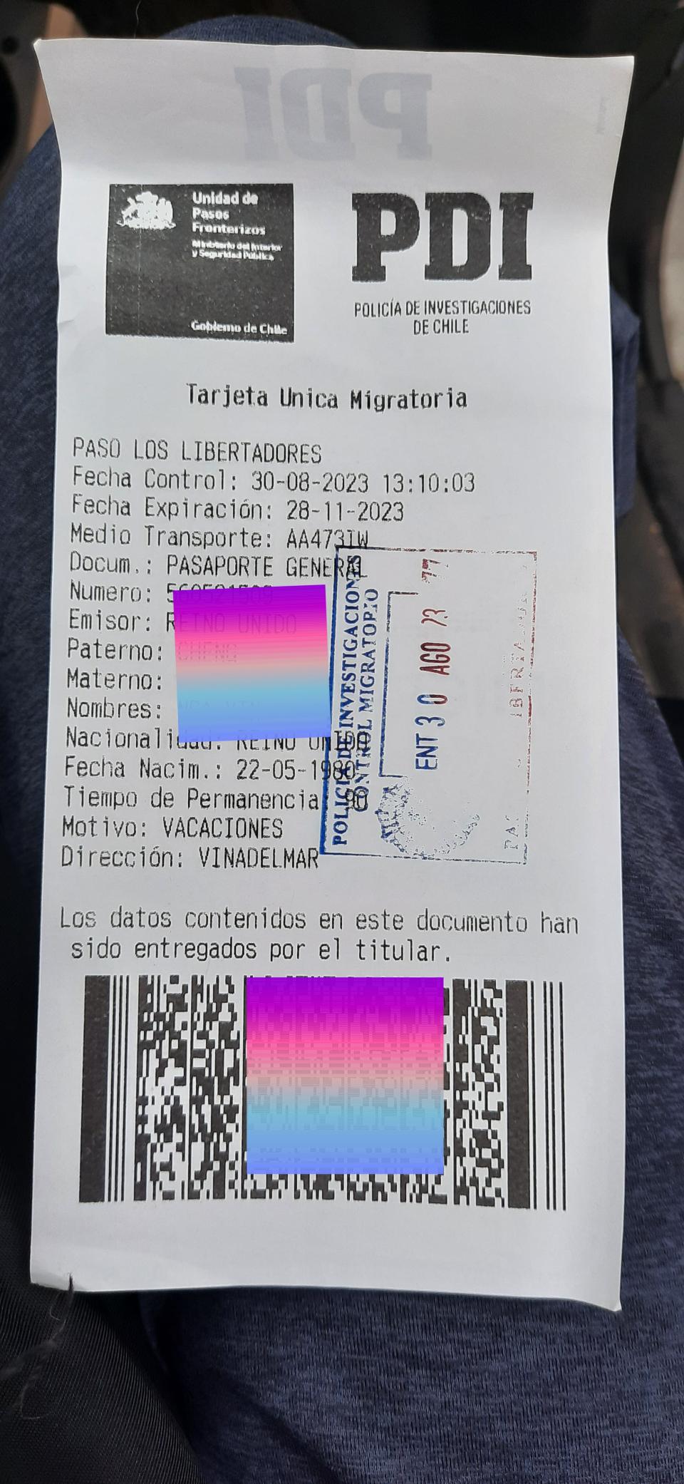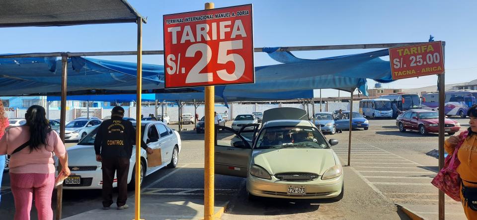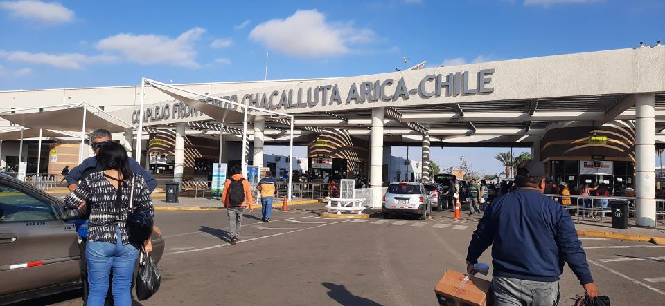 過境過程很順暢,在Tanca車站,司機會先收起乘客的護照,用作車站預先登記,司機再發回給乘客,而且司機給我們填寫海關申報表格過邊境時用。司機載我們5位乘客到了Chacalluta兩國邊境辦公室, 一起排隊,先在秘魯的隊伍處理離境,再帶我們到另一條隊伍排智利入境蓋章,智利邊境職員會給一張PDI小票要保管好。的士司機有一份我們車上乘客名單交給邊境人員,我們約35分鐘便完成蓋章,檢查行李的程序又可以上車離開邊境,入境智利到Arica沿海城鎮了。