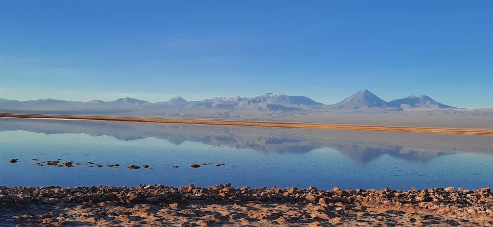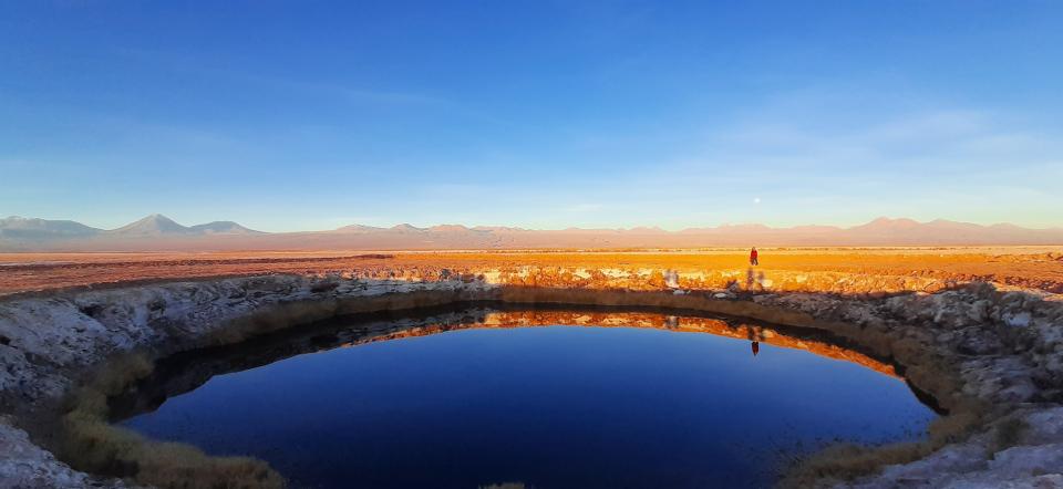 第2站到Ojos del Salar,eyes of the salt flat, 鹽湖之眼。特別之處是看山的倒影,鹽結晶,各逐漸日落的顏色。