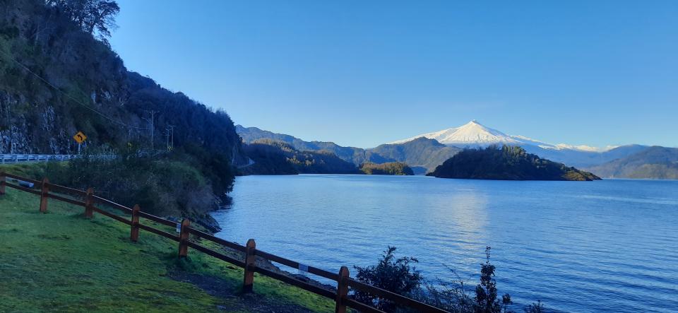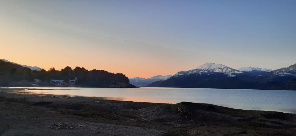 距離Santiago 12小時車程。這個智利湖區前面是湖後面是雪山,是智利人渡假滑雪,遊湖玩SUP,浸溫泉,遠足郊遊的地方,位於智利中南部,不是很多亞洲旅客會到,但是一個很寧靜,夕陽很驚艷的地方。我跟著智利朋友的建議,來到這裡。