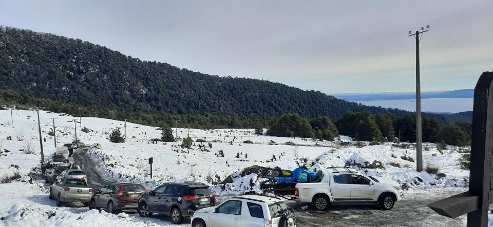 到Villarrica 雪火山近一回距離,天氣很好所以也不至於太凍,看著東邊是冒煙的雪山,西邊是湖景山景,開心自己選了來雪山呢~ 由於7月是智利寒假,很多一家大細也趁天氣好來到雪山玩雪兜,滑雪,雪板,我們到的地方大多是雪兜,極限運動在另一邊沒去看的區域。上山時有點塞車,下山卻要塞一小時,整條山路都被車泊滿真誇張。