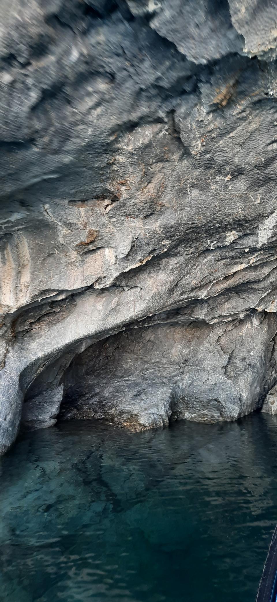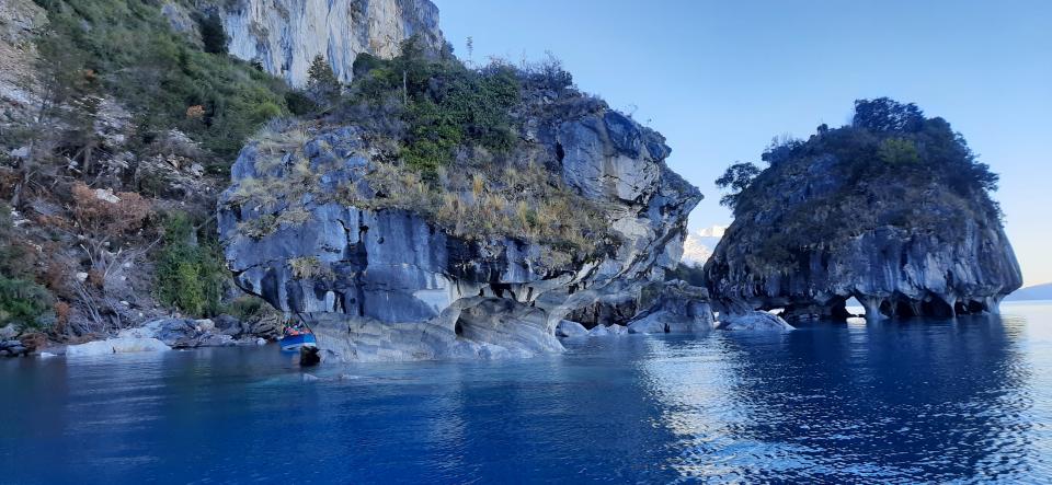 整裝待發,快艇到了大理石洞穴,可以見到最長的洞有45米深,陽光照入洞,未必如早上或夏天那般湛藍,但也覺得大自然鬼斧神工,年輕的大理石有白灰黑啡多種顏色,湖水也是清澈。導遊說這個湖說是南美洲第二大湖,次於Titicaca湖,深度也60米。