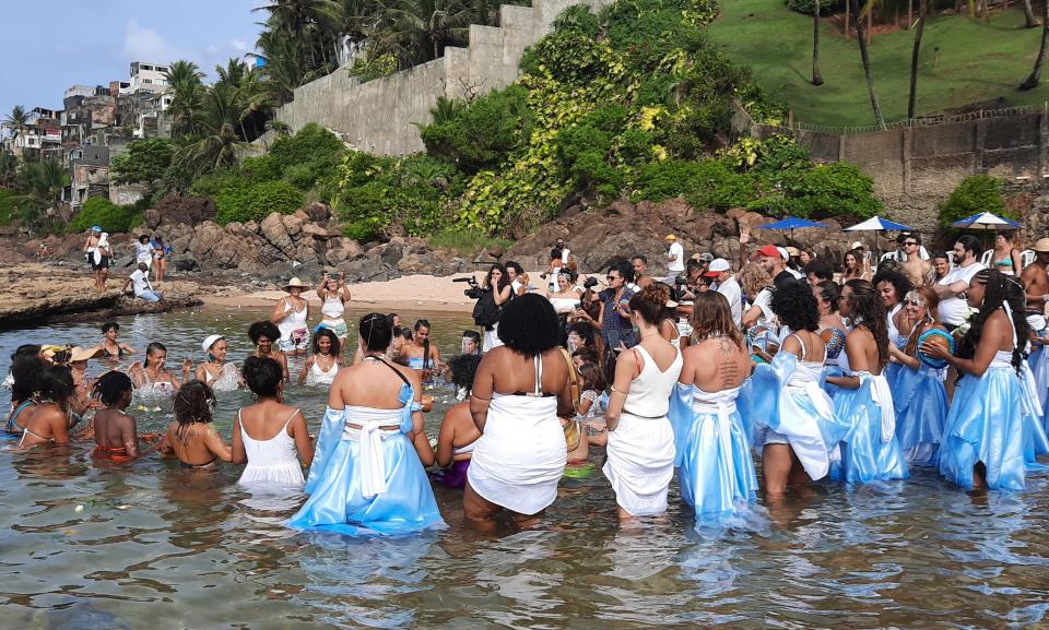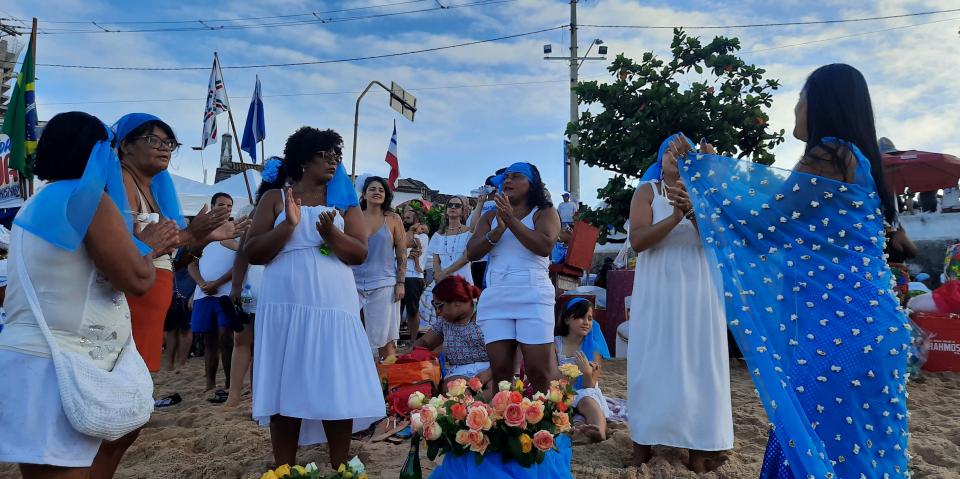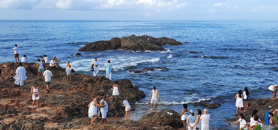 這個我早上4點半起床,準備5點跟巴西的朋友出發,到會場街道很多污糟的垃圾,廢水在地上,周邊有很多攤檔販賣配飾,紀念品,食物飲品。走到海灘有大批信徒及遊客,穿白色或藍色是節日衣著的顏色,拿著白玫瑰 黃玫瑰,走到海邊祈禱許願後將玫瑰送到海裡。一些信徒更會準備花籃,內裡放下一些香水,首飾,梳子,鏡子。一些靈媒為信徒祈福,也一些街頭演奏表演,或者拿著鮮花排隊到Casa de Iemanjá 整個環境很熱鬧。