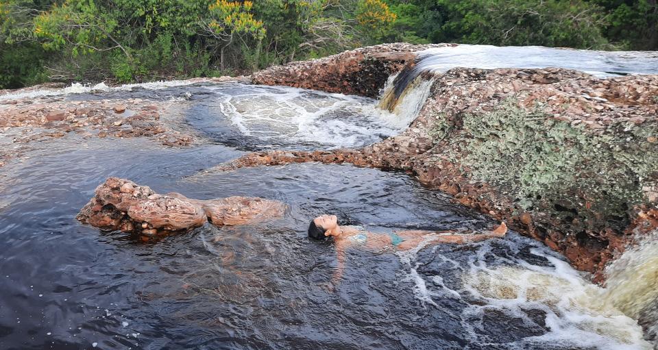 Aman導遊帶我們爬上山到觀景台看遙望Lençois 這個鎮,再繼續在叢林探索,到達Crystal clear 瀑布,眼見時間早所以導遊建議最後才回來游泳,在山徑走有時是平坦小徑有時是大石路要手腳並用,到達Cachoeira da Primavera也是另一個瀑布,再到河與山谷的另一邊,到Salão das Areias Coloridas看那些大石巨石造成的山洞,及Poço Valley瀑布。最後回到起點就是天然水池Serrano了,解散後我們就在水池享受。