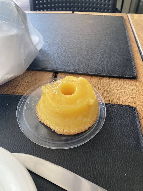 早上9:40離開宿舍。在捷運站附近, 看到便宜的小吃店賣9R的漢堡, 有點心動但是沒有買, 想說下次看到要試試看, 可是沒有下次了。我走進一間好看的麵包咖啡店。買了一顆大火腿巧巴達麵包14R, 店內也有賣包裝熟食, 我順便買了午餐, 烤牛肉片11R(rosbife de lagarto, largarto是蜥蜴的意思, 不過這似乎是常見的巴西烤牛肉片), 椰蓉糕Quindim12R, 是以蛋黃、椰子粉製成的巴西甜點, 呈鮮豔橘黃色, 外型像果凍, 一圈圓形, 中間鏤空, 覺得太甜。