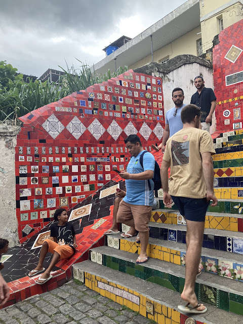 導遊也拿出超大的巴西國旗解釋, 青綠色與黃色代表葡萄牙王室的顏色。導覽的最後一站是Escadaria Selaron, 一座被智利藝術家改造設計過的公用階梯。不過, 這裡也是擠滿觀光客, 走起來也不是很舒服。