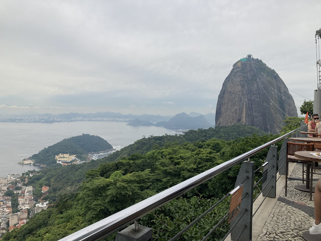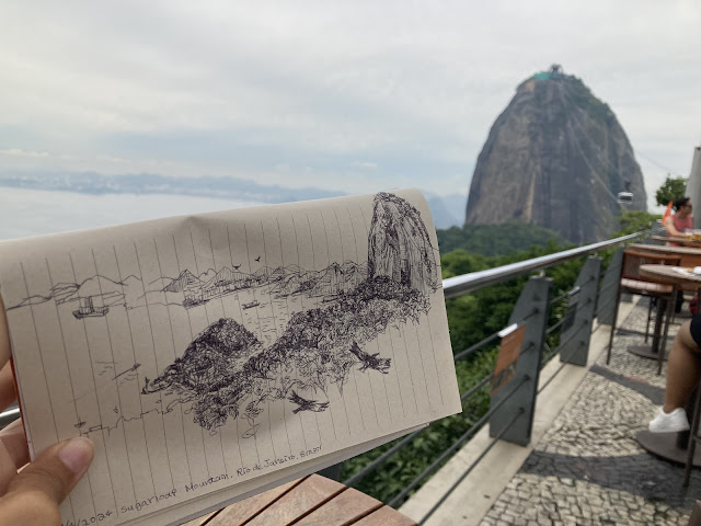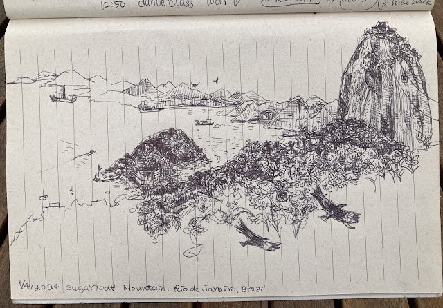 烏爾卡丘纜車站有寬廣好看的公共空間, 寬敞的觀景平台與桌椅, 休憩區域比昨天的耶穌像區域寬敞多了。一些小店與咖啡輕食店, 有havaianas拖鞋店, 便宜的一雙50R。乾淨的公廁。我在有非常好展望的桌椅坐下速寫糖麵包山與山的西側風景。很平靜的海灣, 分散在水面上的帆船, 遠方在雲朵中若隱若現的山脈, 許多翅膀有稜有角的軍艦鳥盤旋在空中。還可以看到飛機在前方起飛。從另一個方向看, 還可以看到救世耶穌像! 不過, 之後我發現這裡有一個直升機停機坪, 直接載遊客去看耶穌, 一人770R, 159美金, 5133台幣。