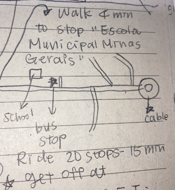 吃飽後。今天想要去拜訪糖麵包山Sugarloaf Mountain。葡萄牙文叫作Pao(麵包) de Acucar(糖)(西文pan de azucar)。想要試著搭公車去, 但是不想要在路上拿出手機看路, 所以畫了簡單的地圖。