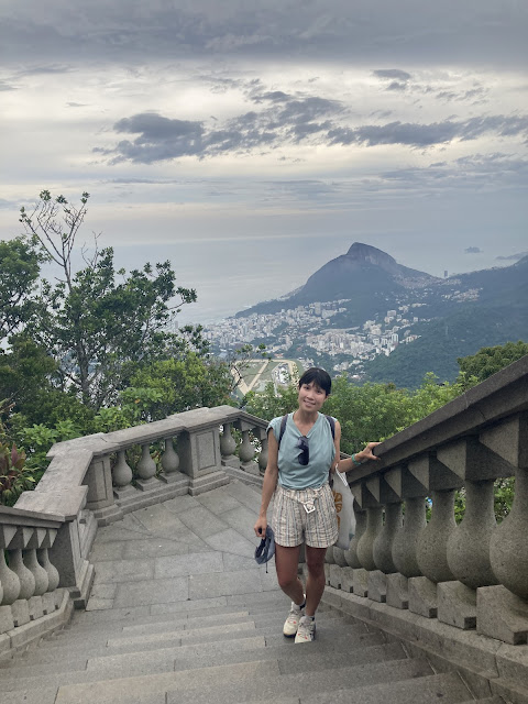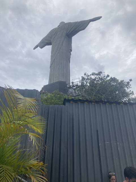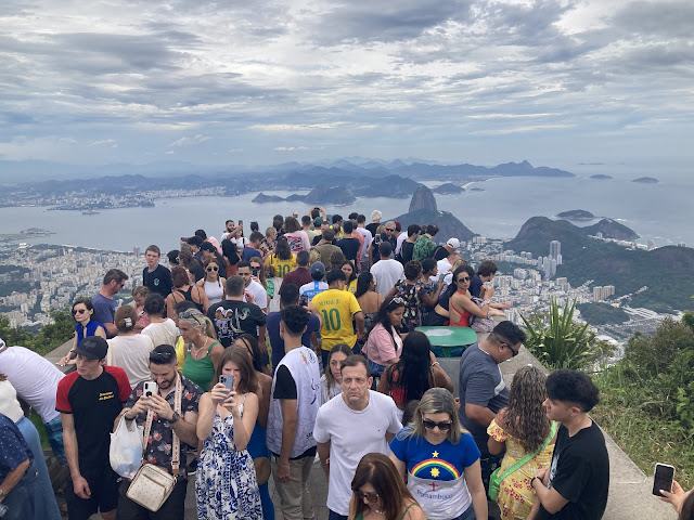 我已事先在網路上訂好今天下午兩點半從市區到救世基督像接駁車。讀了網路的介紹, 要前往就是基督像最受歡迎的方法是搭纜車cable car, 不過纜車排隊的隊伍非常長, 而且網站上可預訂的票已售罄。所以我選擇了接駁小巴上山。有幾個接駁點可以選擇, 我選Praca do Lido, 在Copacabana海灘的北段。我決定從伊帕內瑪的衝浪點沿著海灘慢慢走四十分鐘到那個集合點。