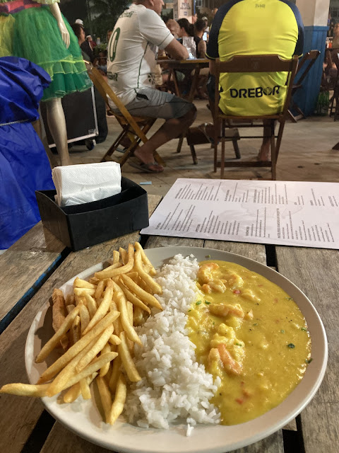 共有五位音樂人, 一位是主唱, 兩位拿著類似吉他的樂器, 兩位拿著鼓類樂器, 都是非常有型且陽光的黑人男性。音樂非常活潑有力、輕快愉悅的氣氛很有感染力、而且是我從沒聽過的獨特音樂類型, 讓我想起在古巴旅遊時, 也是像這樣享受著現場音樂表演。聽眾陶醉地跟著合唱。我點了新的巴西菜, 椰汁海鮮飯Moqueca, 是融合非洲口味的一道料理, 將海鮮、椰奶、棕梠油或橄欖油、洋蔥、番茄、蒜頭、香菜在傳統的陶鍋中燉煮, 配上薯條, 醬汁濃郁美味。定價52R, 付款時另加了10R的音樂費用, 10%的服務費, 但是因為音樂實在太棒, 所以付得心服口服。