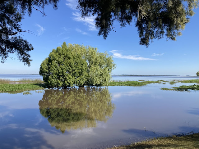 搭車之前, 再次在美麗的河濱步道散步, 西班牙的大道叫做rambla。扶地廷身, 在河濱長椅吃早餐。剛好有早晨散步的當地人跟我聊天, 提到最近這條烏拉圭河淹大水, 這裡的河濱公園被淹沒, 附近其他小鎮也有嚴重災情, 我等一下在Colon有看到整個建築物的下層也被淹了。