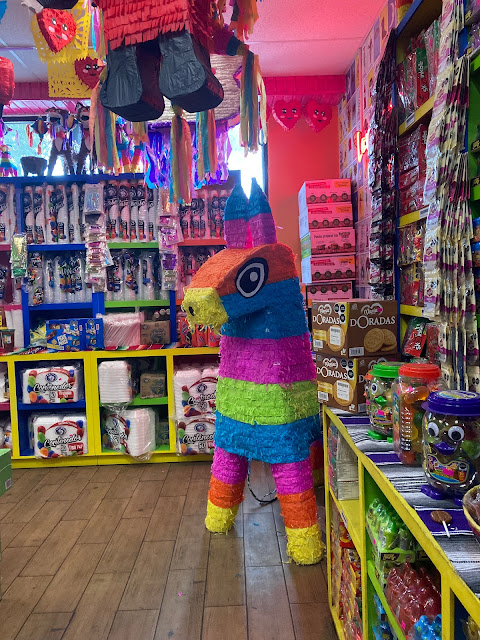 很多商店的商品與內部裝潢都是鮮艷的五顏六色, 很有墨西哥風格, 讓人感到很輕快活潑。先到零食糖果店: 店家熱情提供試吃, 有加糖的芒果乾與其他水果乾, 也有很多大型的皮納塔(piñata), 是一種紙糊的玩偶, 裡面裝滿零食糖果, 在墨西哥小孩生日的生日派對上懸掛起來, 再請壽星用裩棒打擊一番, 直到玩偶破裂, 裡面的零食掉出來。這些皮納塔色彩鮮艷, 有各種造型, 最常見的是七彩驢子、星星、各種卡通造型玩偶, 這裡的店家會密集地將它們懸掛在店內的天花板上。