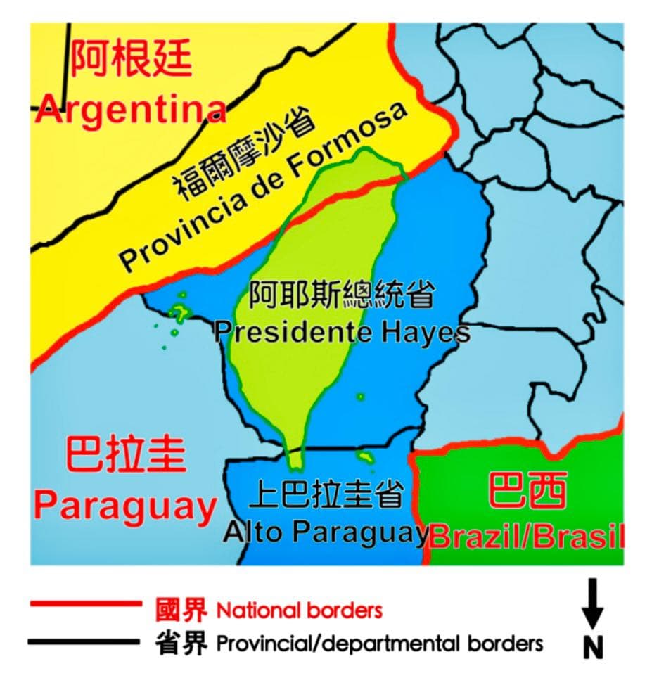 (此圖取自維基百科) 更難得的是這兩個地方都和台灣有某種關係 巴拉圭是台灣在南美洲唯一的邦交國 而附近阿根廷的對應點叫福爾摩沙省 但其實葡萄牙人看到漂亮的地方都會叫Formosa 所以阿根廷方面倒不是太稀奇;而巴拉圭就有趣了